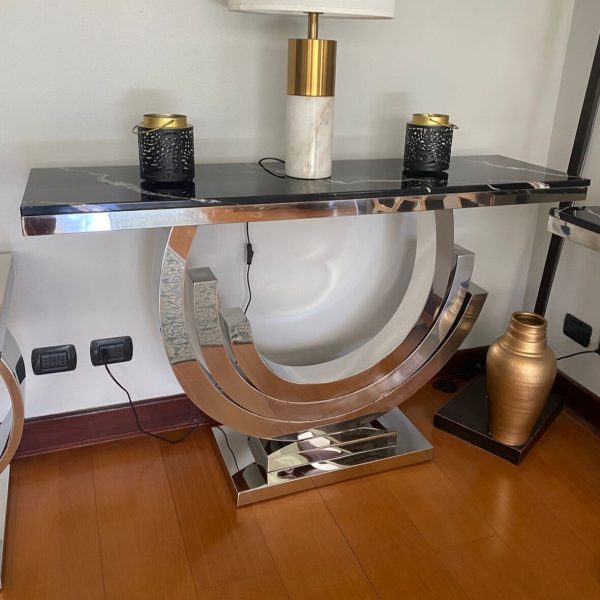 El Arrimo Cronos tiene un diseño único que es perfecto para cualquiera que busque algo lujoso y elegante. Su diseño en base a argollas plateadas entregan un componente de lujo para su hogar, cuenta con cubierta en mármol negro. Este arrimo seguramente se destacara en cualquier hall de entrada o también en espacios como living y comedor.