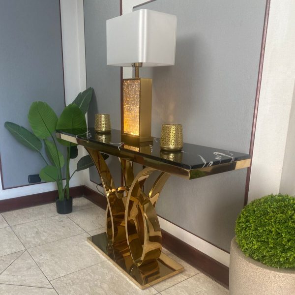 El Arrimo Apolo es una pieza única e imponente, su base de pilares dorados es la mejor opción para quien busca un mueble que haga resaltar su hogar, está compuesta por una cubierta en mármol en colores negro y blanco los cuales combinan a la perfección con su base dorada.